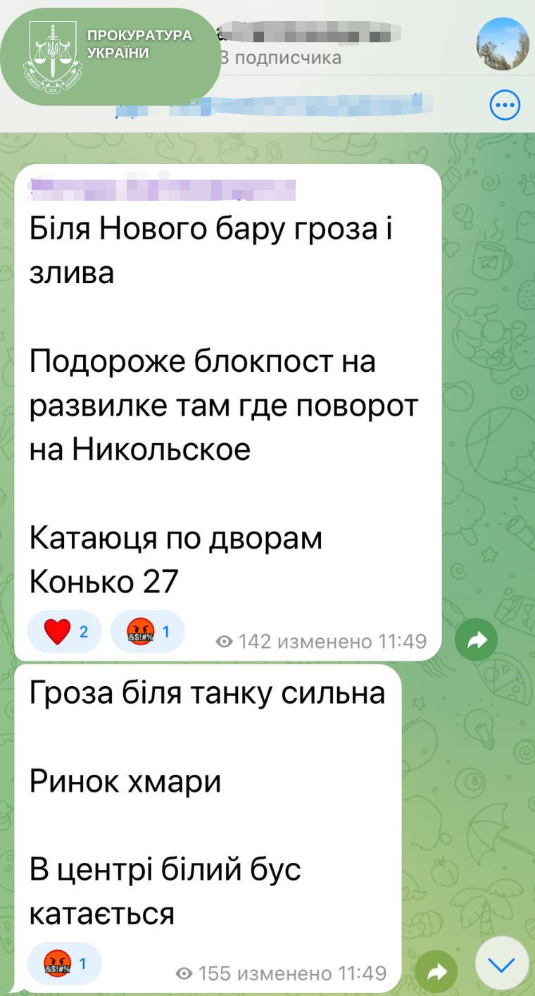 За даними слідства, мешканець Світловодська створив канал із майже тисячею підписників, де публікував повідомлення на кшталт: "Біля суду один синій, два зелених", "Гроза біля танку", "По усьому місту дощить". Для конспірації використовувалися умовні позначення — "Сині" та "Зелені", "Хмари" та "Гроза", що означало перебування чи відсутність працівників Територіального центру комплектування та соціальної підтримки.
