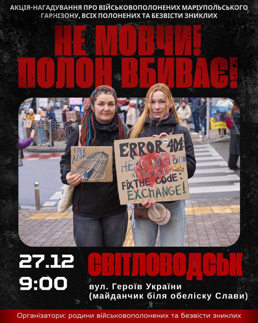 27 грудня у Світловодську пройде акція-нагадування про військовополонених Маріупольського гарнізону, а також усіх українських захисників, які перебувають у полоні або вважаються безвісти зниклими.