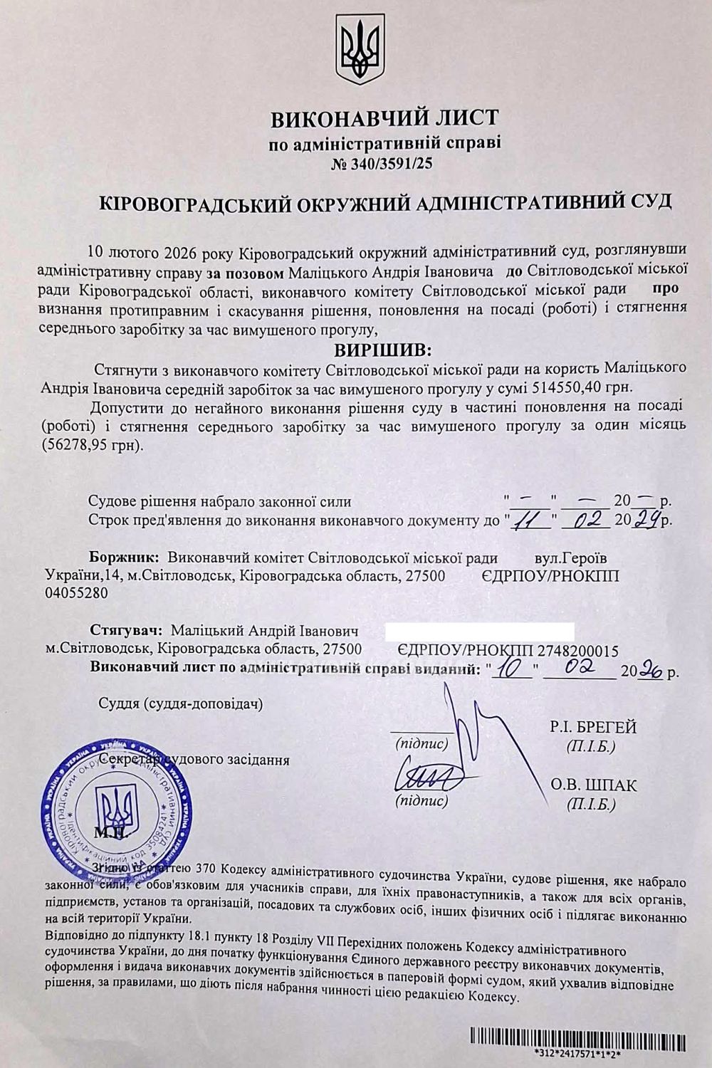 Кіровоградський окружний адміністративний суд ухвалив рішення про поновлення на посаді Світловодського міського голови Андрія Маліцького. Засідання відбулося 10 лютого. Суд постановив поновити Андрія Маліцького на посаді з 14 травня 2025 року. Крім того, ухвалено стягнути зі Світловодської міської ради середній заробіток за час вимушеного прогулу — за один місяць.