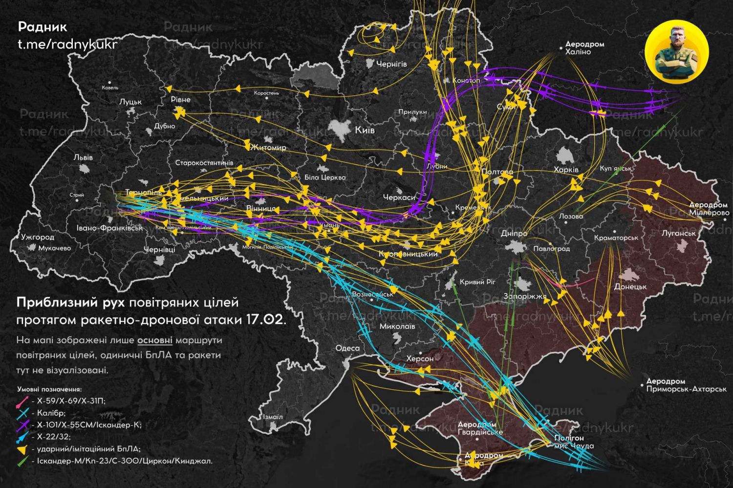 У ніч на 17 лютого (з 18:00 16 лютого) противник атакував 4 балістичними ракетами Іскандер-М із Ростовської обл. – рф, ТОТ Криму, 20 крилатими ракетами повітряного базування Х-101 з акваторії Каспійського моря, 4 крилатими ракетами Іскандер-К з Курської обл. – рф, керованою авіаційною ракетою Х-59/69 із повітряного простору ТОТ Донецької обл., а також 396 ударними БпЛА типу Shahed, Гербера, Італмас та безпілотниками інших типів із напрямків: Курськ, Орел, Міллерово, Брянськ, Приморсько-Ахтарськ, Шаталово – рф., ТОТ АР Крим, близько 250 із них – "шахеди", повідомляють у Повітряних силах ЗС України.