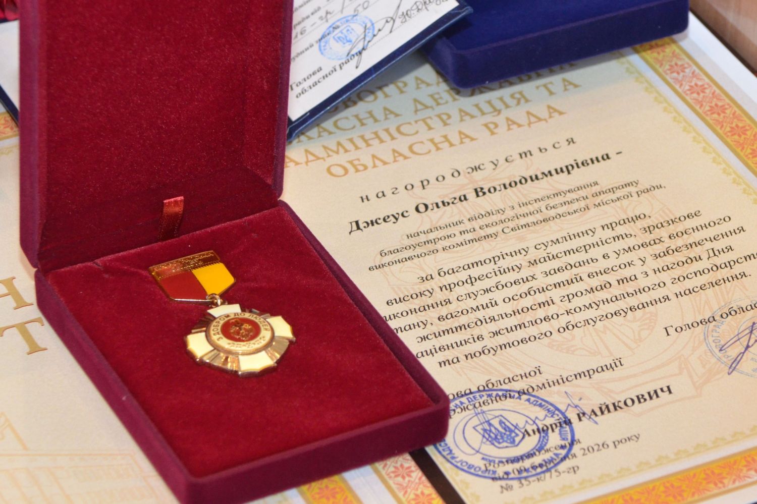 Начальниця відділу інспектування благоустрою та екологічної безпеки апарату виконавчого комітету Світловодської міської ради Ольга Джеус отримала Почесну грамоту Кіровоградської обласної державної адміністрації та обласної ради.